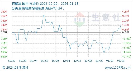 1月18日,生意社棕榈油基准价为7358.00元/吨,与本月初(7120.00元/吨)相比,上涨了3.34%。