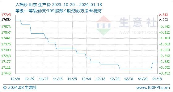 1月18日,生意社人棉纱基准价为17175.00元/吨,与本月初(17100.00元/吨)相比,上涨了0.44%。