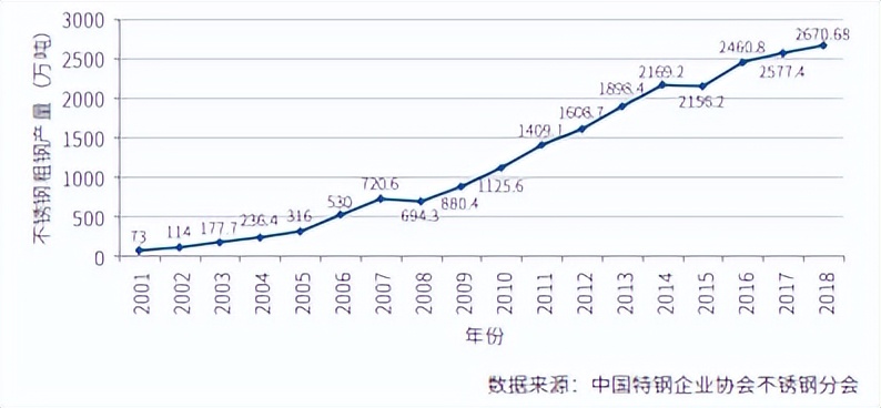新世纪以来,我国不锈钢行业进入了新的发展阶段。2001年我国不锈钢粗 钢产量仅为73万吨;2006年我国不锈钢产量达到530万吨,首次超过日本成为世 界最大的不锈钢生产国; 2018年我国不锈钢产量2670.7万吨,年均复合增长率 14.4%。目前,我国不锈钢产量已占到世界不锈钢产量的50%以上,确立了在世 界不锈钢市场中的重要地位。