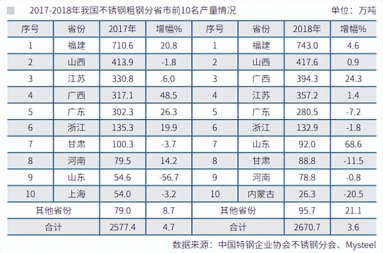 分省市来看,我国不锈钢粗钢产量最大的省市依次是福建省、山西省和广西 省,2018年不锈钢粗钢产量分别为743.0万吨、417.6万吨和394.3万吨,分别占国 粗钢产量的28.0%、16.2%和15.3%。前5省市粗钢产量为2192.6万吨,占国内 粗钢总产量的84.2%。2018年我国粗钢分省市前10名产量情况见下表。
