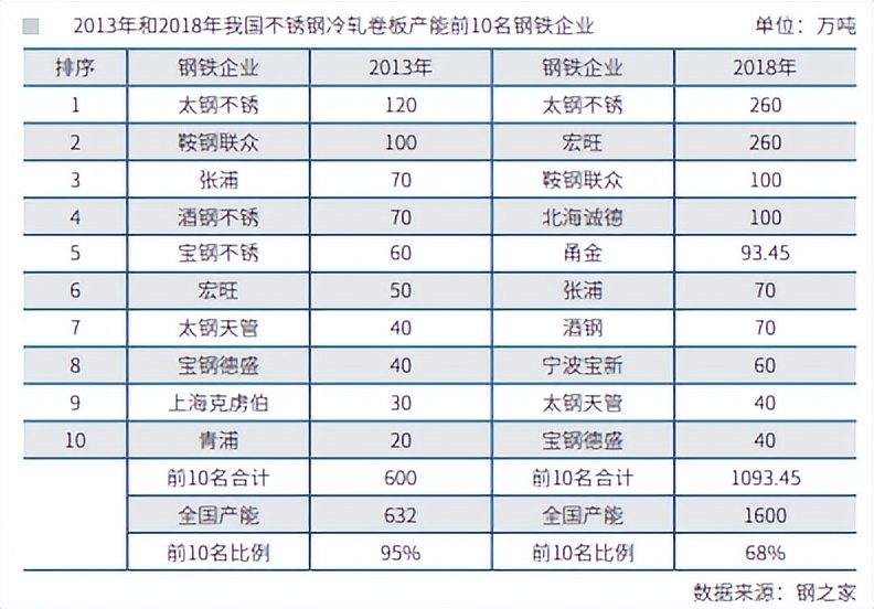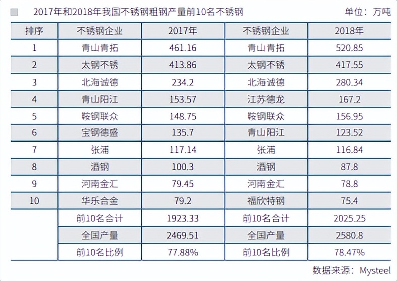 2018年国内前10不锈钢企业粗钢产量为2025.3万吨,占国内产量的78.5%, 行业集中度较高,民营钢厂的产量占比逐渐超过国有钢厂。