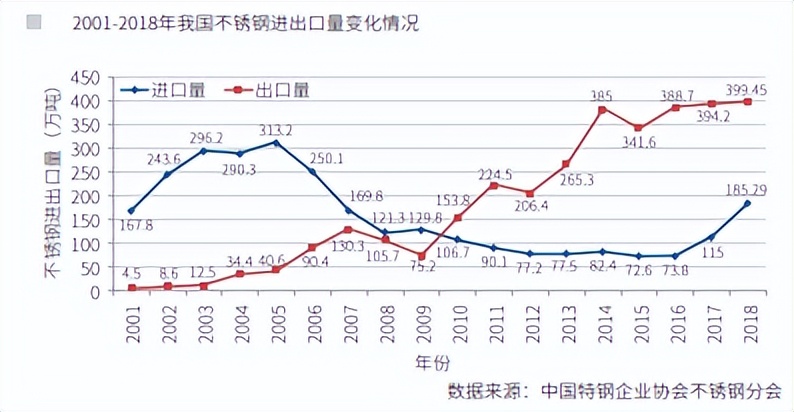 进入新世纪以来,随着我国不锈钢产能扩大,产量快速增长,出口量也逐年 提高。2001年我国不锈钢出口量仅有4.5万吨,2010年增长至153.8万吨,由世界 最大的不锈钢净进口国变为净出口国,改变了长期以来依赖进口的局面。2010年 以后,我国不锈钢出口量继续大幅提升,2018年达到了399万吨,创历史新高。