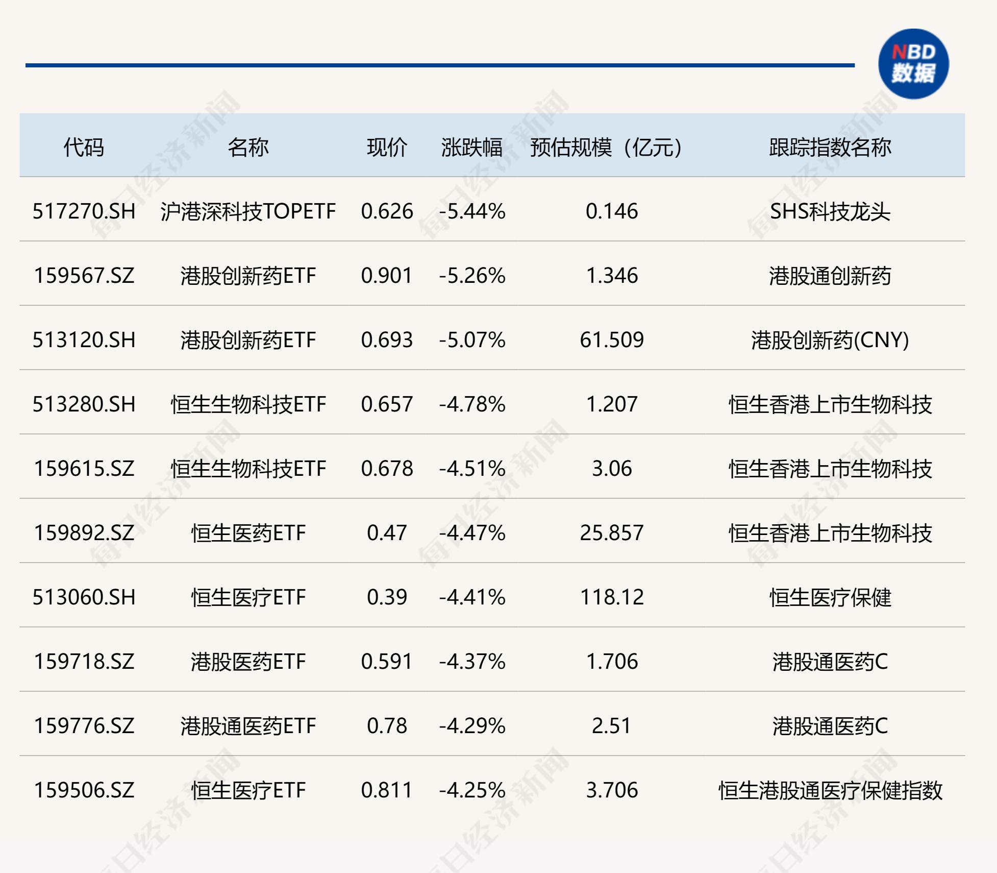 下跌方面,多只港股医药相关ETF跌逾4%。