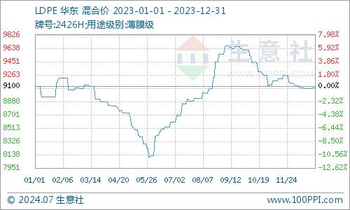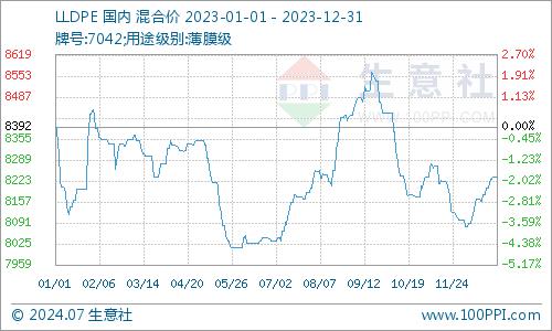 2023年LLDPE年初均价8392元/吨,年底均价8237元/吨,全年跌幅1.86%,2023年LDPE年初均价9100元/吨,年底均价9082元/吨,全年跌幅0.19%,2023年HDPE年初均价8466元/吨,年底均价8500元/吨,全年涨幅0.39%。