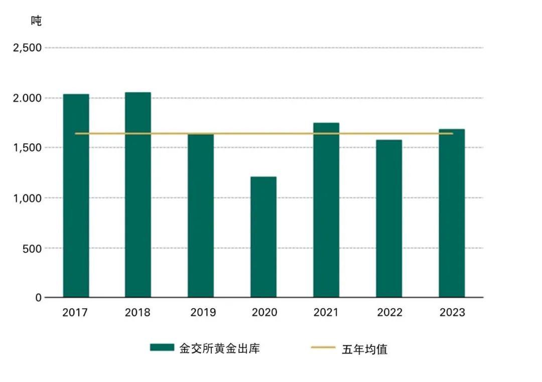 图:2023年上游实物黄金需求走高上海黄金交易所年出库量