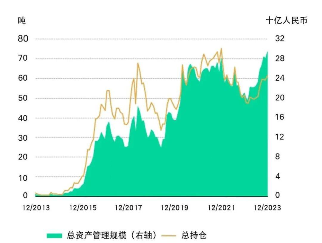 世界黄金协会指出,2023年,中国市场黄金ETF全年流入约合50亿元人民币(+6.54亿美元),领衔全球黄金ETF正需求。截至2023年底,中国市场黄金ETF资产管理总规模(AUM)为290亿元人民币(约合40亿美元),创下以人民币计价的最高纪录。总持仓增加10吨至61.5吨。
