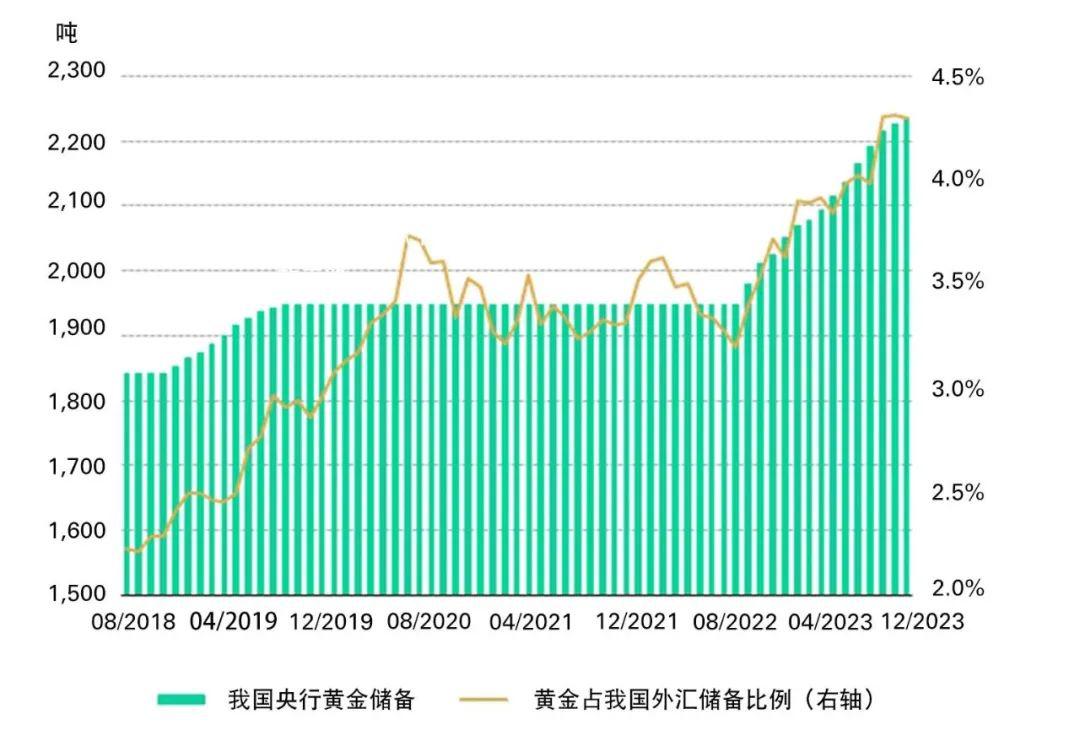 自2022年11月以来,中国人民银行连续购入黄金。2023年,中国官方黄金储备共增加225吨,截至12月底已达2,235吨。目前,黄金占中国官方外汇储备的4.3%。在过去的14个月里,中国官方黄金储备累计增加了287吨。