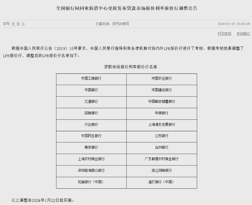 1月19日,据中国人民银行官网消息,全国银行间同业拆借中心受权发布贷款市场报价利率(LPR)报价行调整公告。中国人民银行指导利率自律机制对场内外LPR报价行进行了考核,根据考核结果调整了LPR报价行,调整后的LPR报价行名单从上期的18家增加为20家,新增中信银行和江苏银行。调整自2024年1月22日起实施。