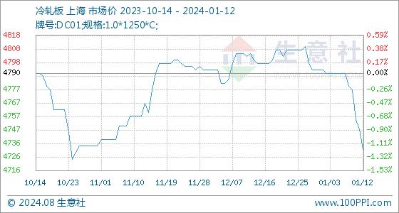 1月12日,生意社冷轧板基准价为4747.50元/吨,与本月初(4792.50元/吨)相比,下降了-0.94%。