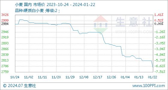 1月22日,生意社小麦基准价为2812.00元/吨,与本月初(2880.00元/吨)相比,下降了-2.36%。