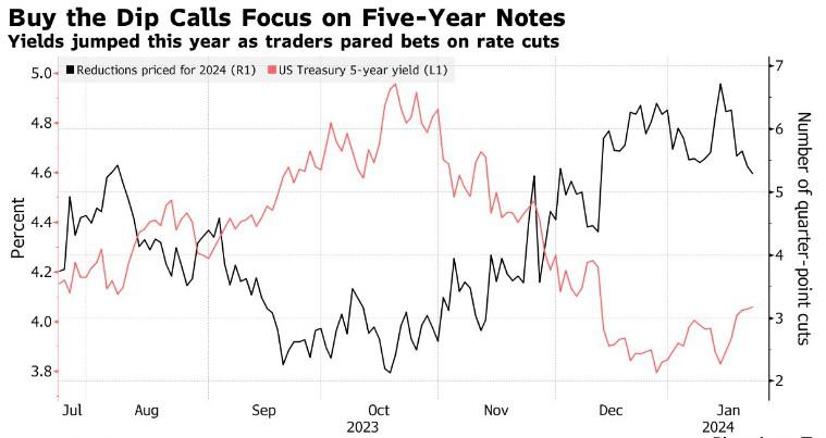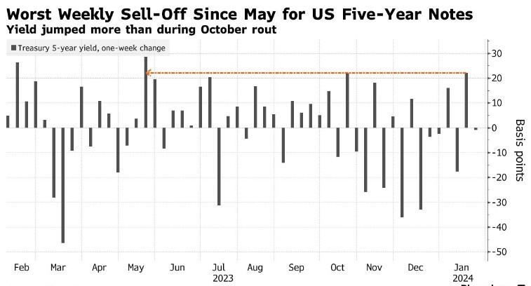 5年期美国国债收益率上周攀升22个基点,为截至5月19日的这一时期以来的最大涨幅,原因是交易员大幅削减了对美联储今年降息的押注。上周五,由于美联储官员的持续推诿,再加上零售销售数据良好,3月份降息的可能性跌至近40%。市场目前预计美联储今年将降息五次25个基点,此前1月12日预计将降息六到七次。