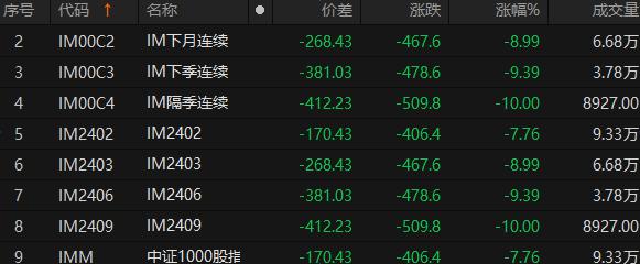 中证1000指数股指期货多个合约今日全天呈现单边下跌的格局,IM2403、IM2406、IM2409合约临近收盘时,甚至都一度罕见跌停。截至收盘,IM2409合约以跌停报收;IM2403、2406合约也都大幅下跌了近9%。