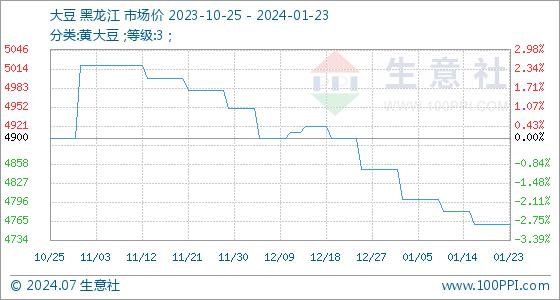 1月23日,生意社大豆基准价为4760.00元/吨,与本月初(4850.00元/吨)相比,下降了-1.86%。