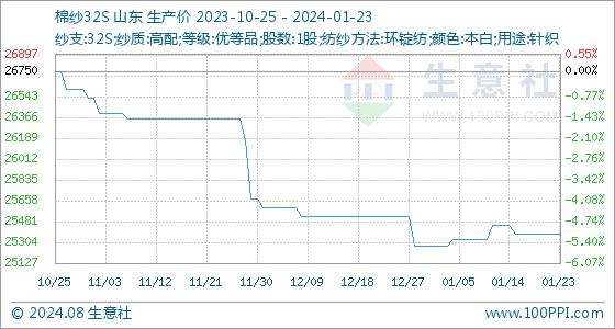 1月23日,生意社棉纱32S基准价为25375.00元/吨,与本月初(25275.00元/吨)相比,上涨了0.40%。