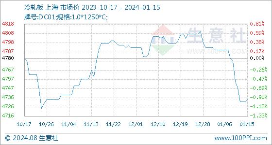 1月15日,生意社冷轧板基准价为4732.50元/吨,与本月初(4792.50元/吨)相比,下降了-1.25%。