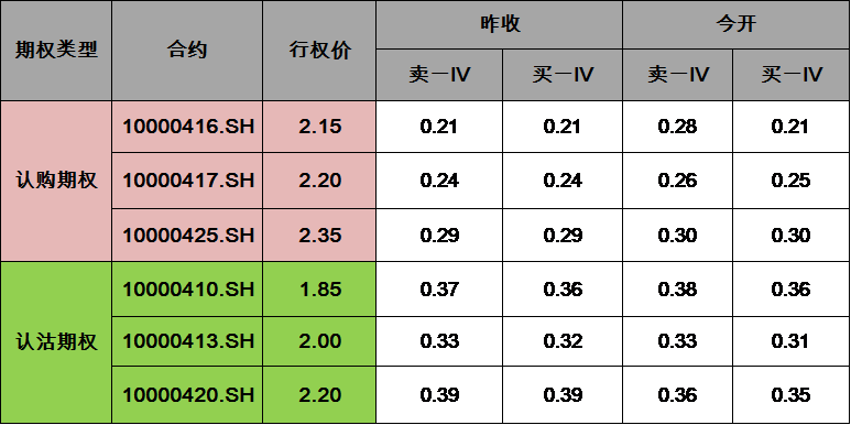 (2)今日持仓最高的三个call行权价分别为2.35、2.20和2.30元;持仓最高的三个put行权价分别为1.85、2.20和2.00元。持仓较高的两个call和持仓最高的三个put成交最为活跃。