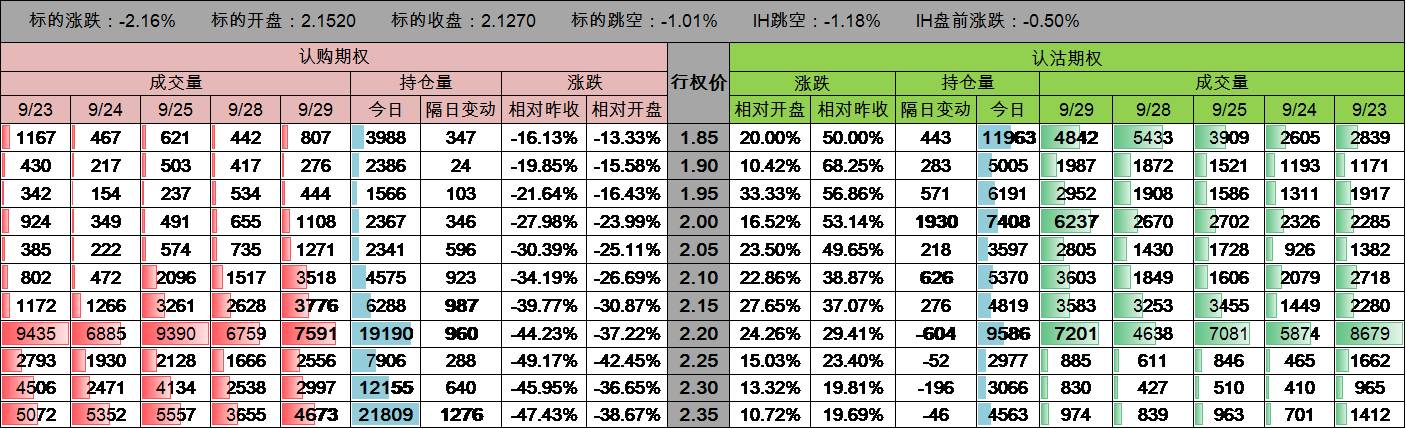 (1)从成交状况看,今天成交量最大的三个call行权价分别为2.15、2.20和2.35元;成交量最大的三个put行权价分别为1.85、2.00和2.20元。成交量call和put均有所回升。