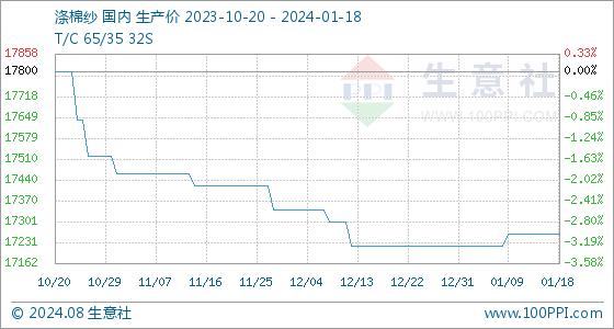 1月18日,生意社涤棉纱基准价为17260.00元/吨,与本月初(17220.00元/吨)相比,上涨了0.23%。