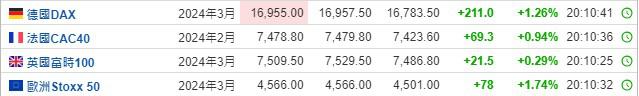 2. 截至发稿,德国DAX指数涨1.26%,英国富时100指数涨0.94%,法国CAC40指数涨0.29%,欧洲斯托克50指数涨1.74%。