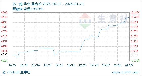 1月25日,生意社乙二醇基准价为4536.67元/吨,与本月初(4307.50元/吨)相比,上涨了5.32%。