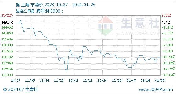 1月25日,生意社镍基准价为130850.00元/吨,与本月初(130033.33元/吨)相比,上涨了0.63%。