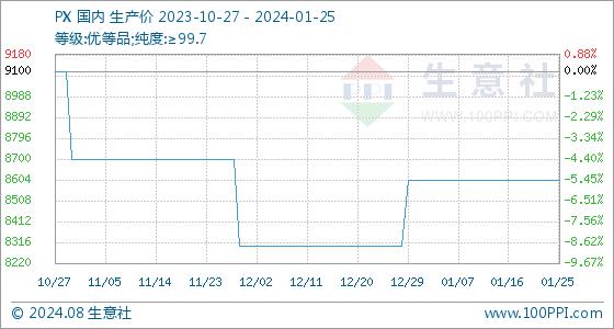 1月25日,生意社PX基准价为8600.00元/吨,与本月初持平。