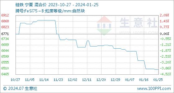 1月25日,生意社硅铁基准价为6502.86元/吨,与本月初(6661.43元/吨)相比,下降了-2.38%。