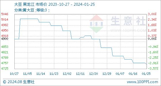 1月25日,生意社大豆基准价为4760.00元/吨,与本月初(4850.00元/吨)相比,下降了-1.86%。