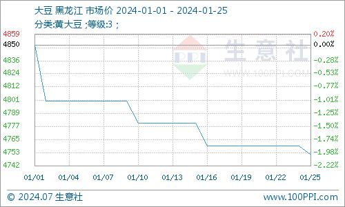 据生意社商品行情分析系统显示:元旦过后,国产大豆行情持续下跌,整个1月国产大豆行情持续走弱。1月1日,国产大豆市场均价4850元/吨,1月25日,国产大豆市场均价4752元/吨,价格下跌2.02%。