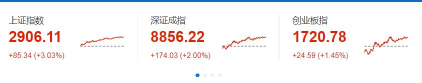昨日,上证指数尾盘一度涨超3%,收复2900点关口!截至收盘沪指涨3.03%,深证成指涨2%,创业板指涨1.45%。