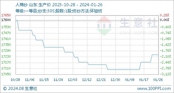 1月26日,生意社人棉纱基准价为17250.00元/吨,与本月初(17100.00元/吨)相比,上涨了0.88%。