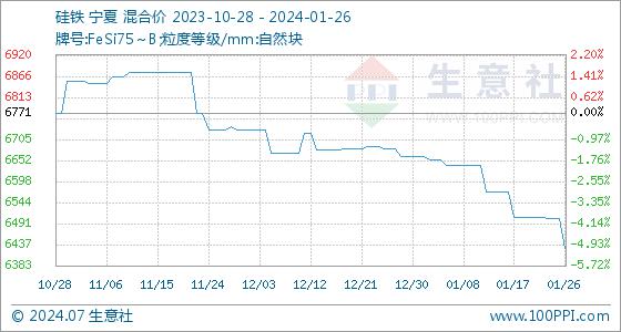 1月26日,生意社硅铁基准价为6502.86元/吨,与本月初(6661.43元/吨)相比,下降了-2.38%。