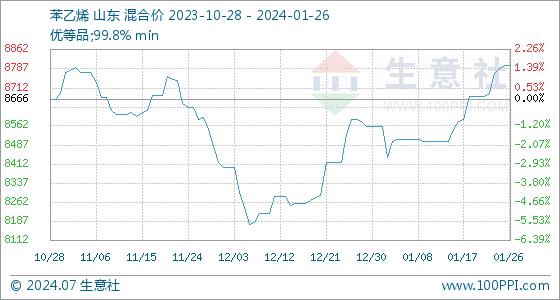 1月26日,生意社苯乙烯基准价为8800.00元/吨,与本月初(8560.00元/吨)相比,上涨了2.80%。
