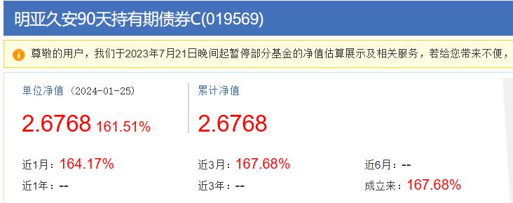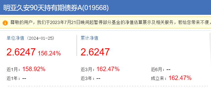 1月25日,记者从当天的净值数据注意到,明亚久安90天持有期债券A类份额的净值大涨156.24%,C类份额的净值大涨161.51%。