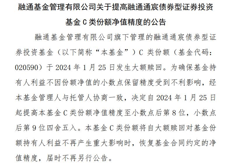 比如今日,太平基金公告称,太平恒泰三个月定开债券基金C类份额于2024年1月24日发生大额赎回。决定自2024年1月24日起提高基金C类份额净值精度至小数点后八位,小数点后第九位舍去。