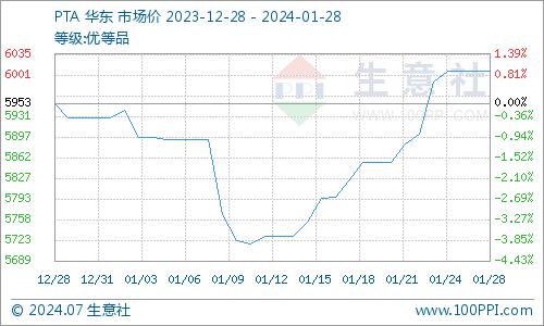 红海危机进一步升级,国际原油价格维持震荡上行,截止1月25日,美国WTI原油期货主力合约结算价报77.36美元/桶,布伦特原油期货主力合约结算价报81.96美元/桶。PTA大厂计划检修增多,市场供应预期改善,预计3月份PTA库存或将由累库预期转变为去库预期,使得部分贸易商出现惜售情绪,不断助推PTA价格。截止1月28日华东地区PTA市场均价在6007元/吨,较1月11日上涨5.05%。