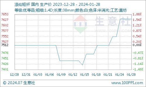 成本推涨型行情再现,据生意社商品行情分析系统,1月中旬以来国内涤纶短纤市场行情持续上行,截止1月28日江浙主流工厂1.4D*38mm均价在7632元/吨,较1月15日上涨2.83%。涤纶短纤生产企业检修装置增多,开工下滑。但需求面,下游开工继续降低,对涤纶短纤刚需偏弱,拖累价格涨幅。