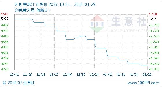 1月29日,生意社大豆基准价为4752.00元/吨,与本月初(4850.00元/吨)相比,下降了-2.02%。