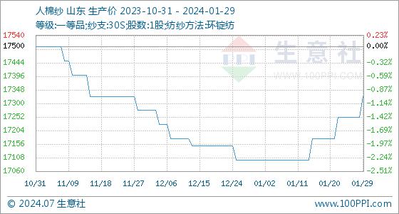1月29日,生意社人棉纱基准价为17250.00元/吨,与本月初(17100.00元/吨)相比,上涨了0.88%。