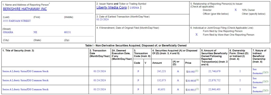 根据美国SEC公告平台上的数据显示,巴菲特旗下的伯克希尔公司在1月23日到1月25日期间,每天都买入追踪自由媒体集团旗下天狼星XM权益的追踪股LSXMA,加上此前1月12日到1月17日期间买入的LSXMK,共计买入超过140万股。