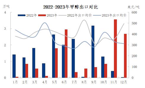 进出口方面,2023年我国甲醇进口依赖度约为15%。2023年1-12月中国甲醇累计进口量为1455.30万吨,同比涨19.36%,中国甲醇累计出口量为14.97万吨,同比下跌13.42%。2023年我国甲醇进口量维持高位,自3月上旬伊朗甲醇装置恢复稳定后,海外甲醇装置开工率升至高位,同时海外甲醇产能进一步释放,2023年海外甲醇投放产能181.5万吨,海外甲醇供应体量增加。进口利润支撑下,流入中国的甲醇供应量也有所提升。