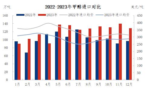 2023年,甲醇上半年价格整体回落,下半年价格筑底反弹,整体呈现“V”型走势。春节后,由于下游需求消费不及预期,加之成本煤炭松动,甲醇价格高位回落。二季度开始,受美联储加息、煤制成本大跌以及进口量激增等因素影响,甲醇价格加速下行至年内低点,直到6月中旬逐步企稳。三季度,一方面煤炭迎峰度夏旺季煤价快速上涨,甲醇成本不断上移,另一方面国内宏观、地产等政策利好频发,带动甲醇下游需求全面提升。此外美联储7月后暂停加息也使得海外需求得以恢复。9月中下旬,持续推高的库存引发甲醇价格高位回调,加之甲醇成本出现松动,甲醇行情一度偏弱运行。11月后,随着气温下降,煤制成本再度企稳,下游刚需水平较高,甲醇低位重获支撑,震荡整理为主。