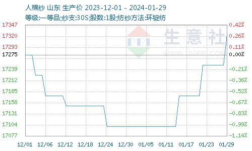 上周(2024年1月22—28日),人棉纱行情整体稳中偏强,纱厂报价提升,优惠略有缩减,整体出货一般,人棉纱开工负荷小幅下降至66%左右,库存基本维持。多数微亏状态维持生产,市场对后期信心不足。截止1月28日人棉纱(30S,环锭纺,一等品)出厂均价为17325元/吨,较上上周价格上涨150元/吨,涨幅0.87%。