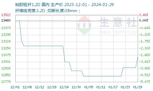 据生意社商品行情分析系统显示,上周(2024年1月22—28日),粘胶短纤整体价格稳中上涨。截止1月28日,1.2D*38mm粘胶短纤国内地区出厂报价为13060元/吨,较上上周价格上涨220元/吨,涨幅1.71%。