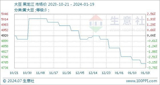 1月19日,生意社大豆基准价为4760.00元/吨,与本月初(4850.00元/吨)相比,下降了-1.86%。