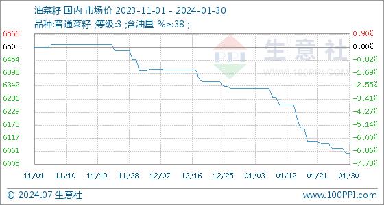 1月30日,生意社油菜籽基准价为6052.00元/吨,与本月初(6332.00元/吨)相比,下降了-4.42%。