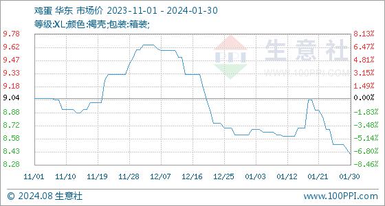 1月30日,生意社鸡蛋基准价为8.45元/公斤,与本月初(8.62元/公斤)相比,下降了-1.97%。