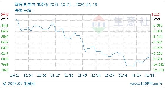 1月19日,生意社菜籽油基准价为8116.67元/吨,与本月初(8180.00元/吨)相比,下降了-0.77%。