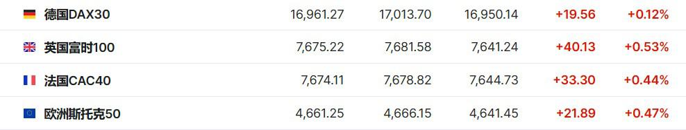 2.截至发稿,德国DAX指数涨0.12%,英国富时100指数涨0.53%,法国CAC40指数涨0.44%,欧洲斯托克50指数涨0.47%。