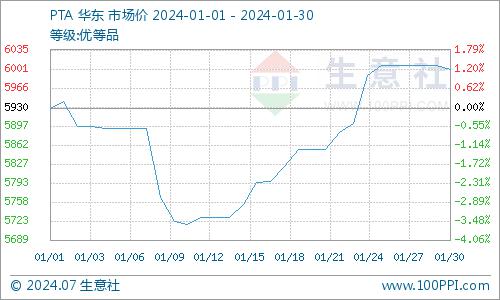 国内PTA市场行情1月份同样呈现先跌后涨“V”型走势,截止1月30日华东地区市场价格6002元/吨,较月初上涨1.25%。目前多家PTA供应商官宣装置检修计划,市场供应预期改善,叠加下游聚酯开工高于往年同期,部分聚酯工厂计划春节期间检修时间较短,且普遍对春节后PTA需求持乐观态度,部分贸易商出现惜售情绪,支撑PTA价格不断走强。